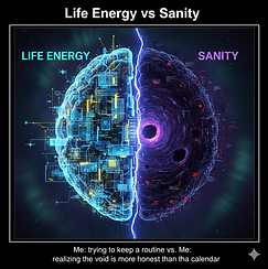Two key resources define the player's journey: Life Energy and Sanity. Life Energy functions much like it does in our daily existence—representing motivation, routine, and purpose. Actions like planning a daily schedule, maintaining a healthy habit, or simply existing in a structured system all contribute to your Life Energy.